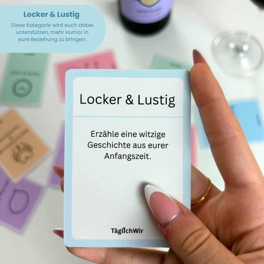 TäglichWir ist nicht nur irgendein Beziehungsspiel. Es wurde von erfahrenen Paaren entwickelt, die ihre eigenen Herausforderungen gemeistert haben. Mit 5 Kategorien und über 50 Fragen und Aufgaben ist es das beste, was du für eine tiefere Verbindung in deiner Beziehung tun kannst.